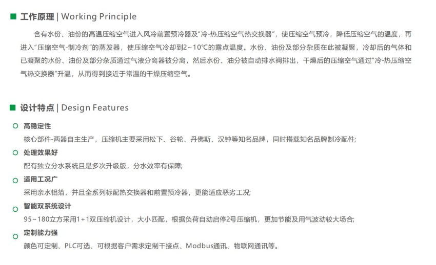 处理效率:受冰点、制冷换热效率和气水分离器分离效率的影响,冷冻式干燥机能达到的压力露点通常为2°C~10°C,相对较高。